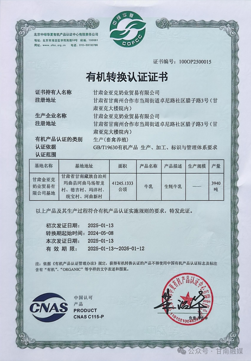 玛曲县昌翔清真肉业有限公司申报的“玛曲牦牛肉”“玛曲藏羊肉”有机产品和甘肃金亚克奶业贸易有限公司申报的“玛曲牦牛牛乳”有机产品,分别在2023年和2025年经北京中绿华夏有机产品中心专家评审,符合全国绿色有机农产品标准要求,获得有机转换证书。以上2家企业申报有机产品的基地拥有有机草场面积达100余万亩。