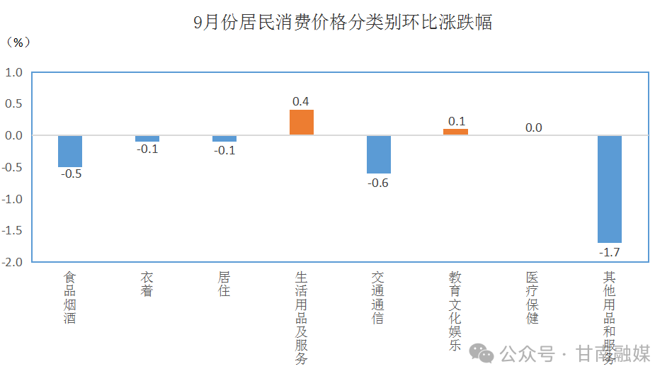 9月份,甘南居民消费价格环比下降0.3%。其中,食品价格下降0.7%,非食品价格下降0.2%;消费品价格下降0.2%,服务价格下降0.4%。