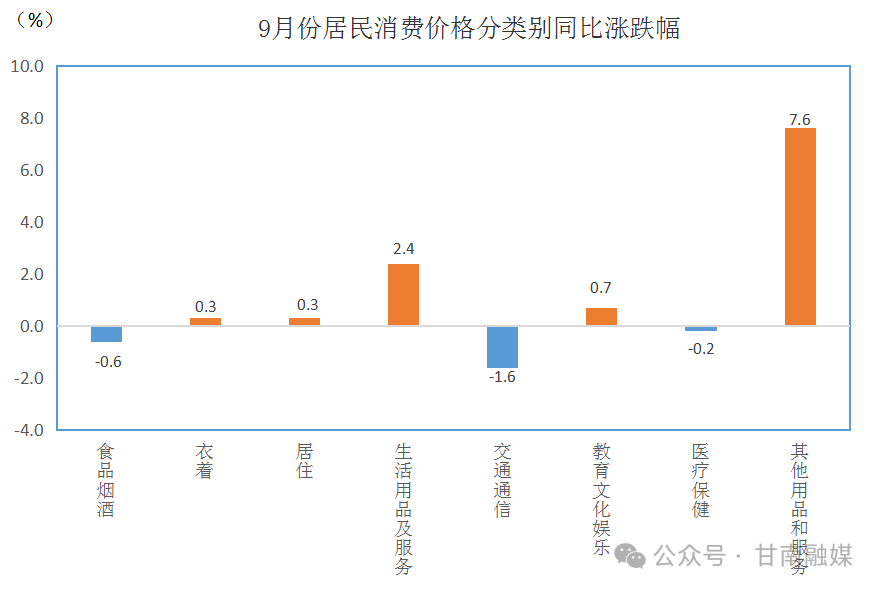 9月份,食品烟酒类价格同比下降0.6%,影响CPI(居民消费价格指数)下降约0.19个百分点。食品中,畜肉类价格上涨3.5%,影响CPI上涨约0.18个百分点,其中猪肉价格上涨1.3%,影响CPI上涨约0.02个百分点,牛肉价格上涨4.8%,影响CPI上涨约0.07个百分点,羊肉价格上涨6.5%,影响CPI上涨约0.12个百分点;薯类价格上涨6.2%,影响CPI上涨约0.02个百分点;鸡蛋价格下降12.7%,影响CPI下降约0.10个百分点,鲜菜价格下降6.0%,影响CPI下降约0.16个百分点,鲜果价格下降13.8%,影响CPI下降约0.24个百分点。