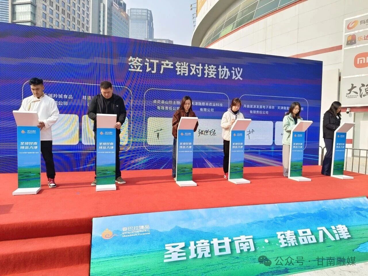 活动期间,甘南州商务局相关负责人及企业负责人进行了产品推介,签订甘南藏餐进驻天津市场意向协议、甘南禾壹供销农特产品开发有限责任公司入驻“甘味”品牌天津运营中心协议、甘南禾壹供销农特产品开发有限责任公司与天津伍创电子商务有限公司合作协议,甘南州企业与天津企业产销对接协议。现场,天津人民艺术剧院相声演员万毅夫和刘纪铭(红鲤鱼与绿鲤鱼)受聘为甘南农特产品天津区推介大使。