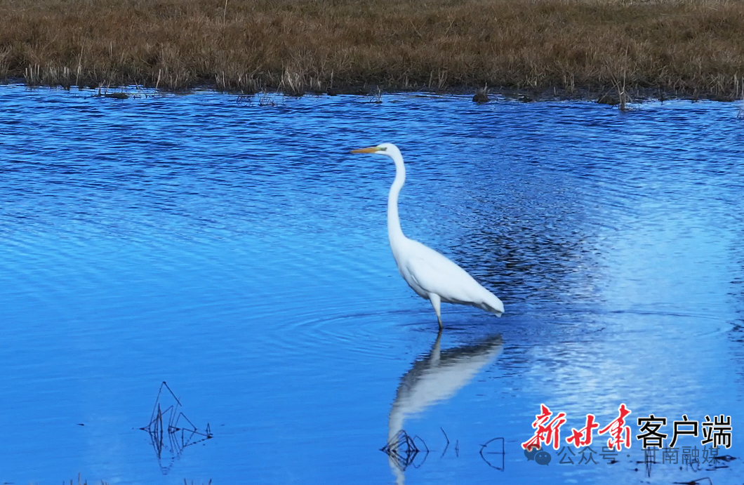 近日,玛曲县河曲马场湿地内,十几只白鹭正优雅踱步、低头觅食,洁白的身影与澄澈的水域、泛黄的草甸相映成趣,构成一幅灵动的生态画卷。