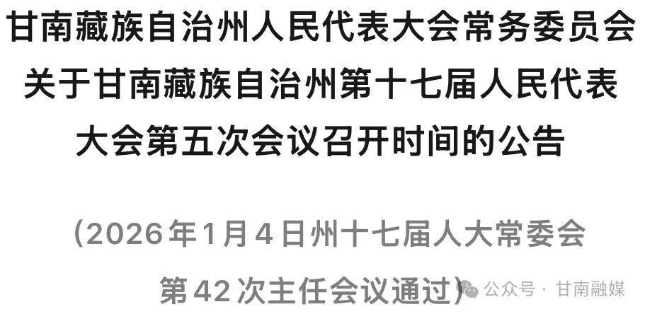 甘南藏族自治州第十七届人大常委会第42次主任会议研究决定,甘南藏族自治州第十七届人民代表大会第五次会议于2026年1月12日至15日在合作召开,会议建议议程不变。