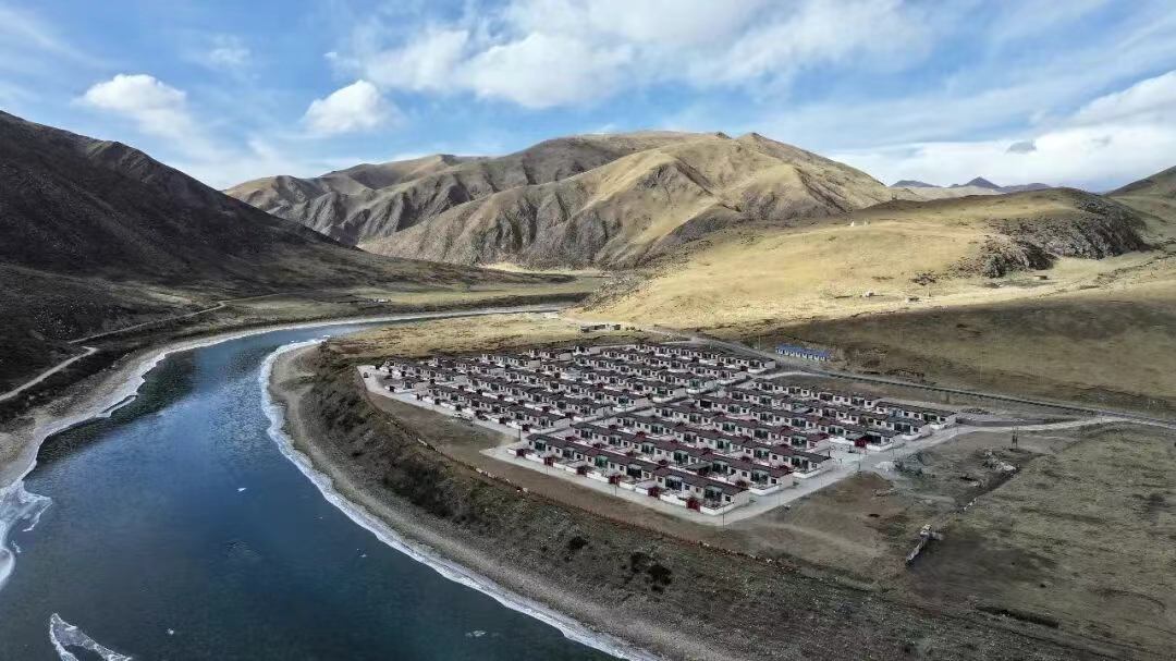 目光从黄河水转向草原深处,黄河岸易地搬迁定居点的房屋错落有致、整整齐齐地排列着,在冬日的暖阳下显得格外温馨。