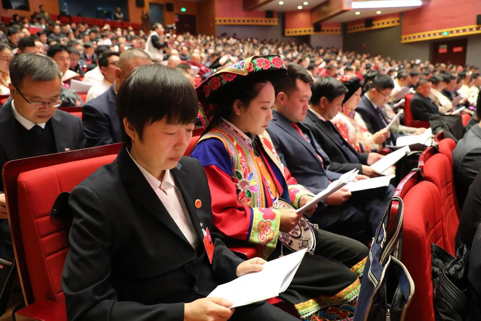 9时整,大会开幕!全体起立高唱国歌,雄壮的旋律在会场久久回荡,激荡着每一位代表的心潮。随后,州长杨武走上报告席作《政府工作报告》,代表们端坐整齐,神情专注,会场内格外安静,这一刻,全体代表的期盼都凝聚在这份沉甸甸的报告之中。