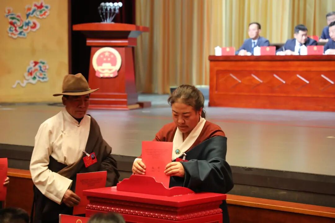 会后,新当选的甘南藏族自治州第十七届人民代表大会常务委员会委员,州人民检察院检察长向宪法进行了宣誓。