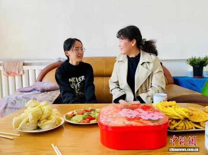 图为郭建宏(右一)和上高二的马晓瑞(左一)拉家常。(资料图)受访者供图