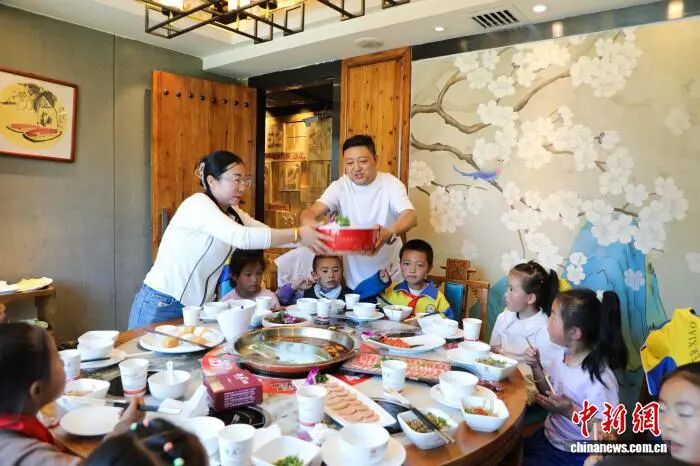 图为2025年为庆祝“六一”国际儿童节,刘小成(中间白衣短袖)请甘南州合作市200位小朋友吃火锅。(资料图)受访者供图