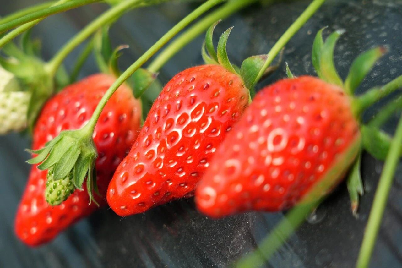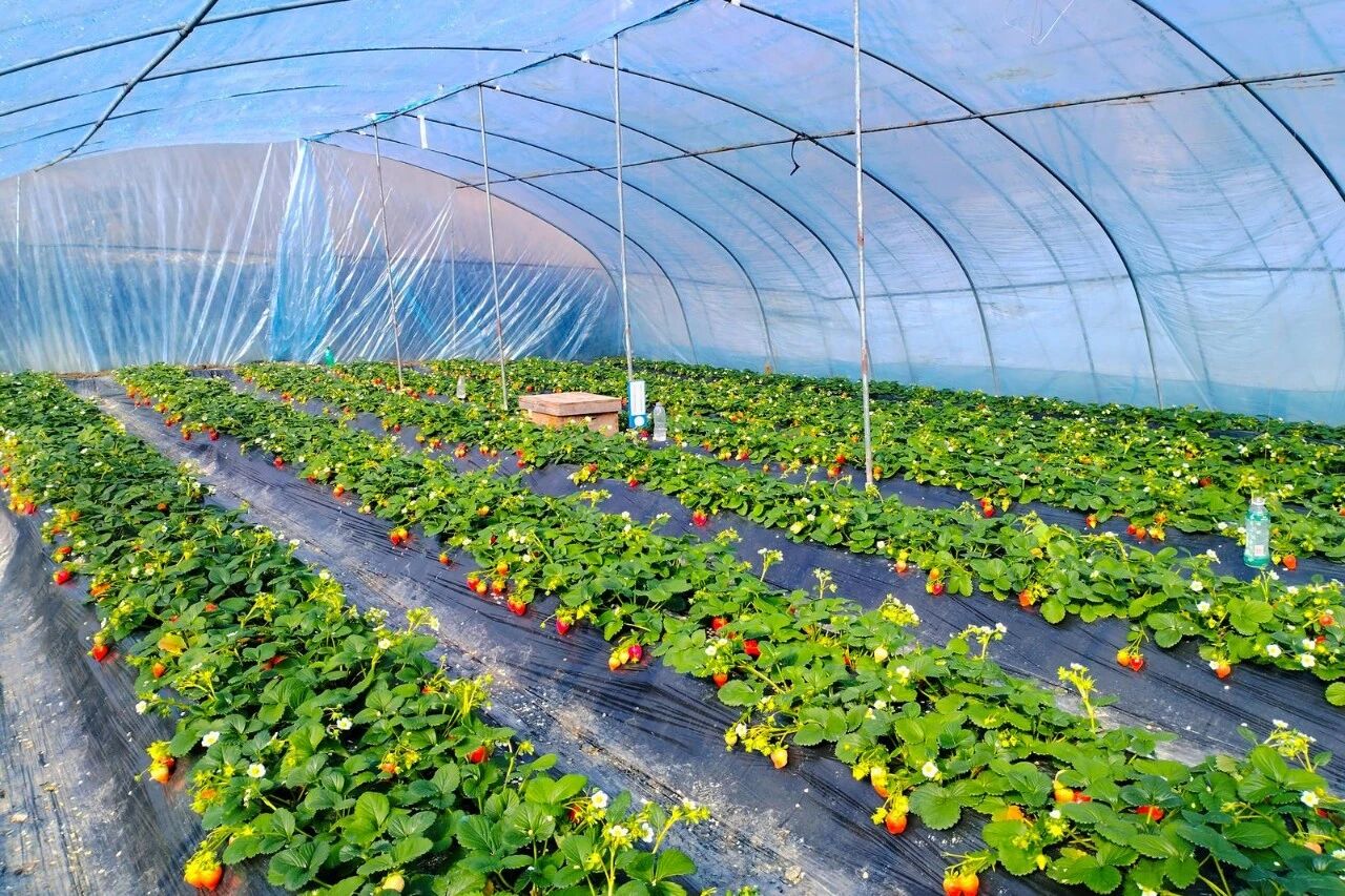 走进大棚里,湿润的暖风裹挟着浓郁的草莓香气扑面而来,一排排草莓植株郁郁葱葱,茁壮的绿叶下,殷红的果实探头露脸,色泽鲜亮、形态饱满,让人垂涎欲滴。棚内随处可见携家带口、结伴而行的游客,大家手提采摘小篮,穿梭在整齐的垄间,时而俯身细挑慢选,时而举果相视欢笑,尽情享受冬日里的鲜甜滋味与惬意田园时光。
