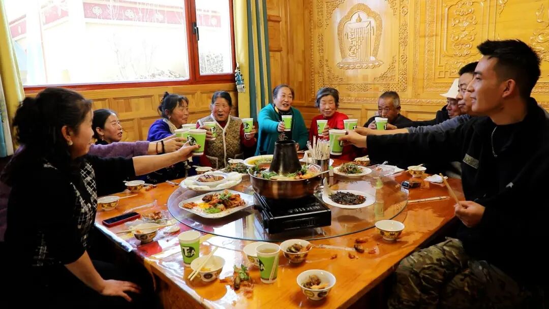 “以往过年比干活还累!”刚咬下一口腊肉蕨菜卷饼的田学鹏放下筷子,语气里满是感慨,“以前每到正月,挨家挨户拜年,光拜年就得十几天,山路得跑好几趟,遇上雪天路滑还得小心翼翼。长辈忙着备菜,累得直不起腰,我们喝酒应酬也伤身。”田学鹏指着桌上热气腾腾的藏式暖锅笑道,“今年我们家亲戚组织团拜,三十多口人聚在卓玛林源农家乐,不用赶路、不用攀比,坐下就吃现成的洮河宴,唠唠庄稼的收成、聊聊打工的见闻,饭后还能一起唱歌娱乐,人均消费才100多元,这才是过年该有的轻松样。”田学鹏和亲朋好友们互相敬着青稞酒,分享着一年的收获,欢笑声在藏式庭院农家乐里久久回荡。