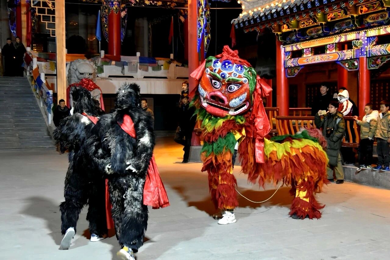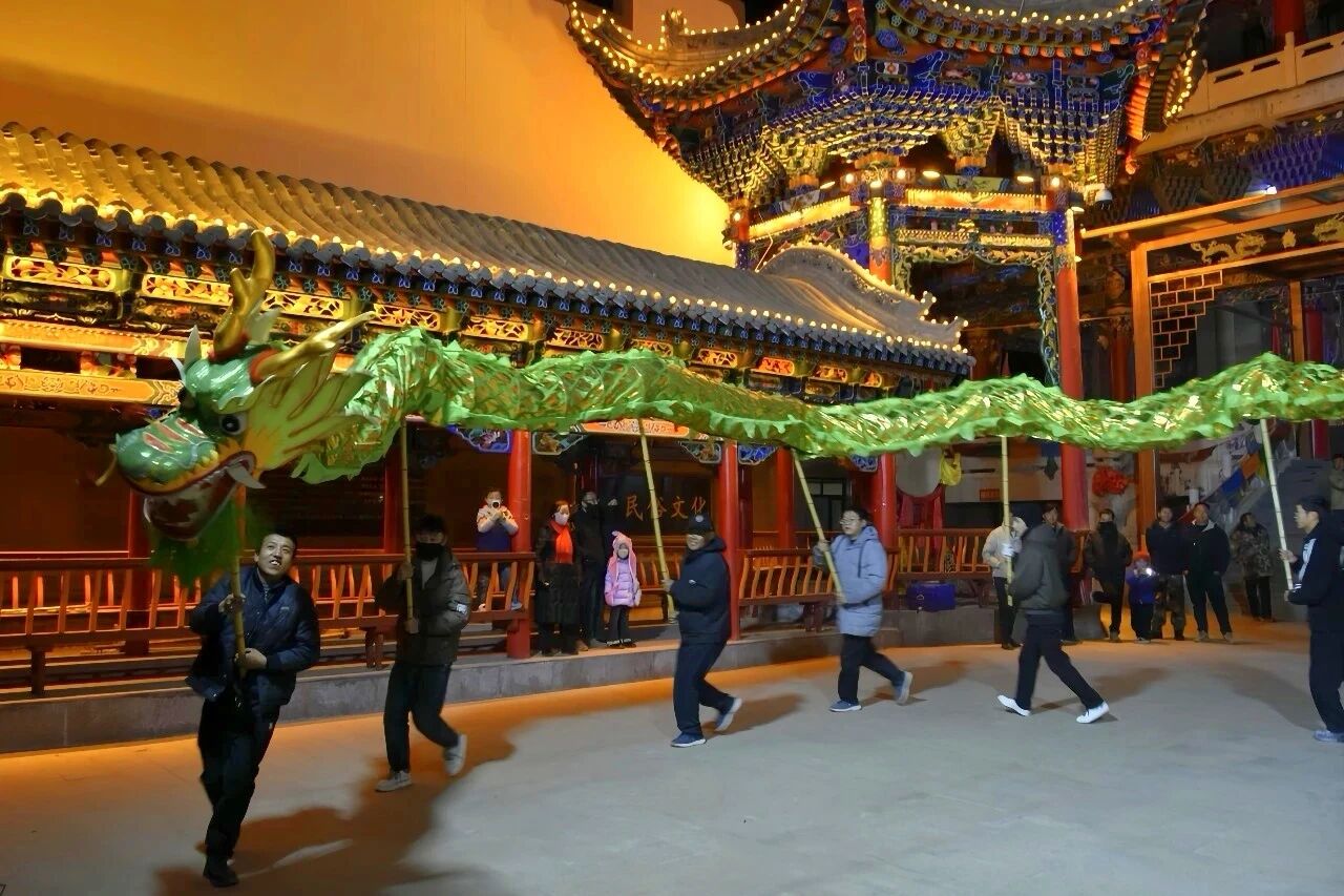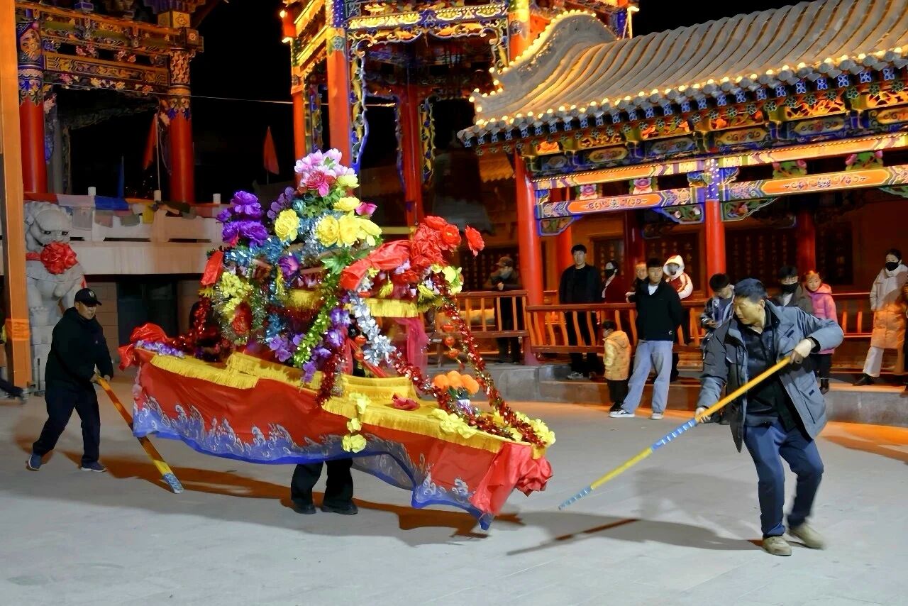 夜幕降临,华灯初上,洮州农民文化宫早已人声鼎沸,锣鼓声、欢笑声与呐喊声交织成冬日里最动人的新春交响。十余名队员手举黄绿相间的长龙,随着指挥的节拍腾挪跳跃、翻转盘旋,龙身在空中划出优美弧线,时而如惊雷穿云,时而如碧波荡漾,气势十足。一旁的“雄狮”眨着灵动的眼睛,甩动着斑斓鬃毛,与憨态可掬的黑色毛熊相互嬉闹、默契互动。划旱船的队员们身着艳丽喜庆的服饰,手推旱船迈着轻盈碎步,摇摆间宛如船只在水面悠然划过,将渔家生活的灵动与新春的喜庆演绎得惟妙惟肖。