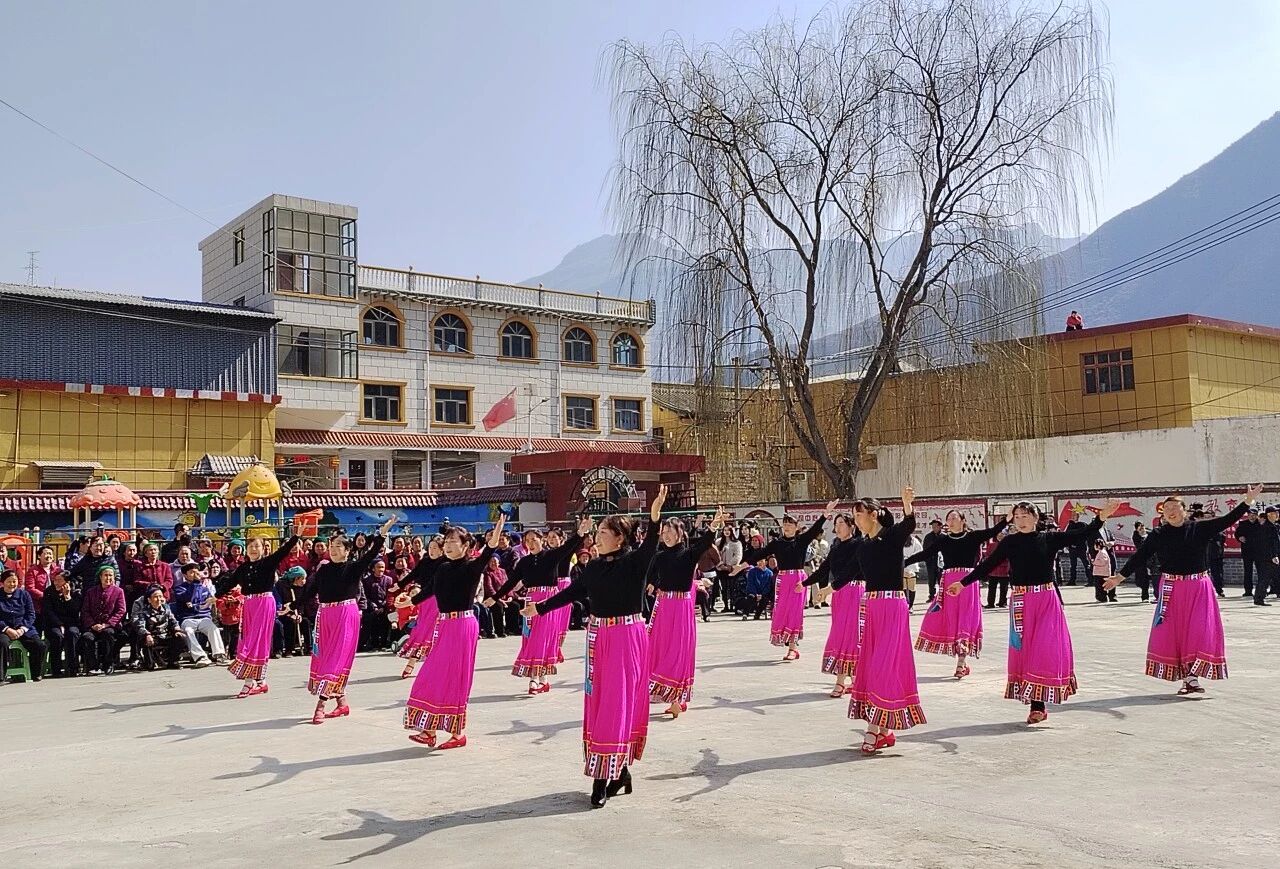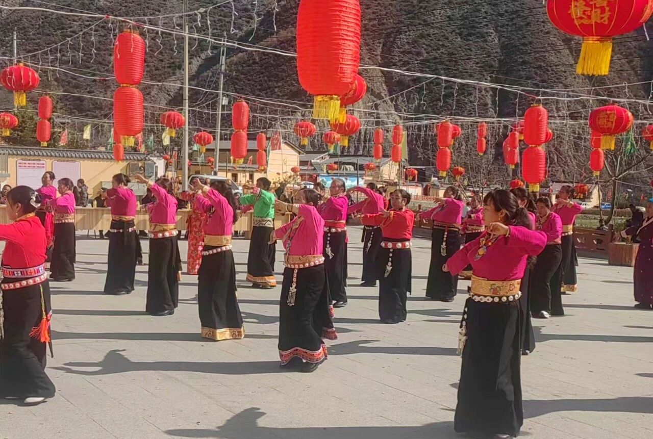 峰迭镇各村文化广场上,喜庆的旋律此起彼伏。村民们身着鲜艳服饰,踏着欢快的节拍翩翩起舞,扭起秧歌、跳起锅庄,用热情的舞姿传递新春的喜悦。在城外村党群服务中心前,演员们精神饱满,动作整齐划一,台下观众围坐一堂,不时拿出手机记录精彩瞬间,欢声笑语回荡在广场上空。