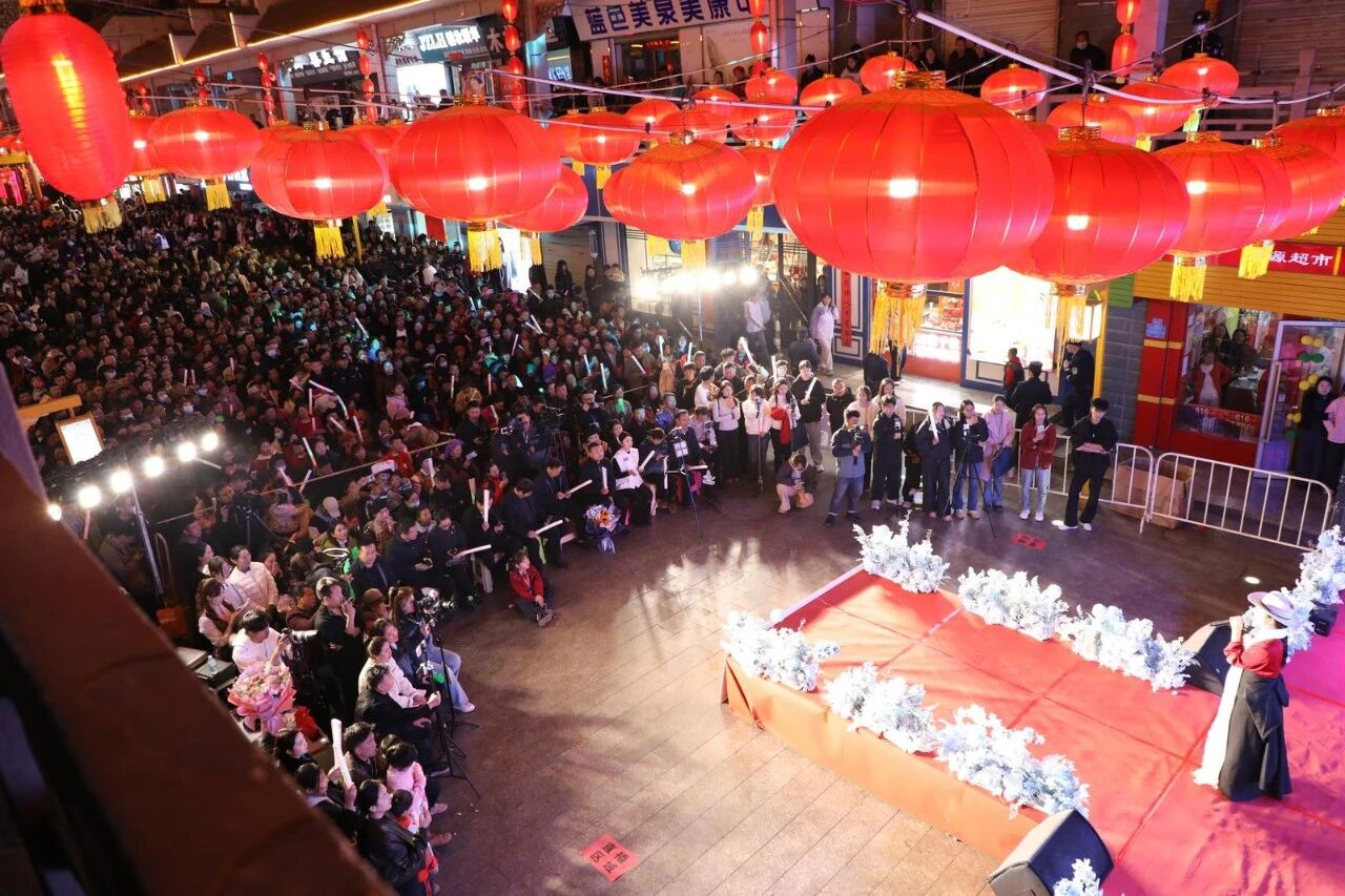 夜幕低垂,整条楹联街巷灯火璀璨、人头攒动,往来游客与本地居民络绎不绝,穿梭在流光溢彩的街景与琳琅满目的特色摊位之间。商家的热情吆喝、观众的阵阵欢呼、民俗演艺的鼓乐声交织回荡,热闹气息扑面而来,一眼望不到头的人流,将冬日的夜晚烘得暖意融融、人气爆棚。