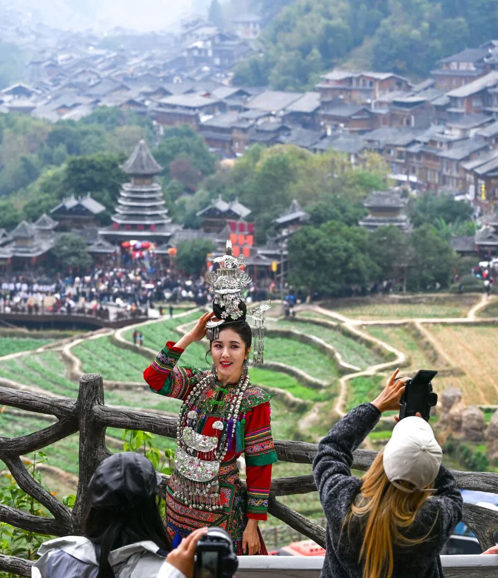 游客在贵州省黎平县肇兴侗寨观景台留影(2025年12月20日摄)。新华社记者 杨文斌 摄