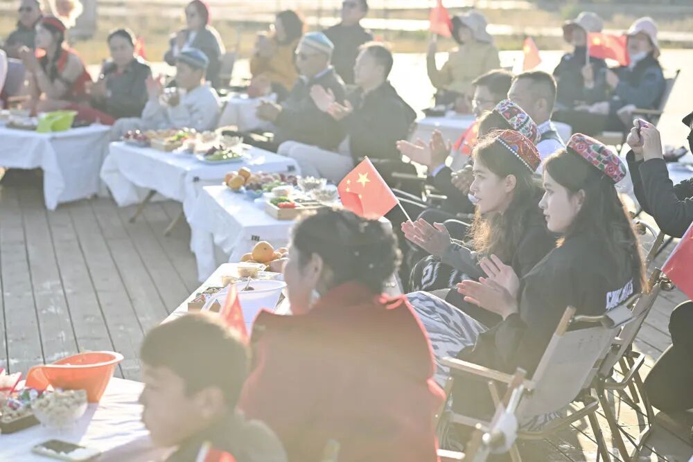 江苏泰州援疆干部人才与昭苏农牧民家庭代表齐聚,观看节目(2025年10月6日摄)。新华社记者 胡虎虎 摄