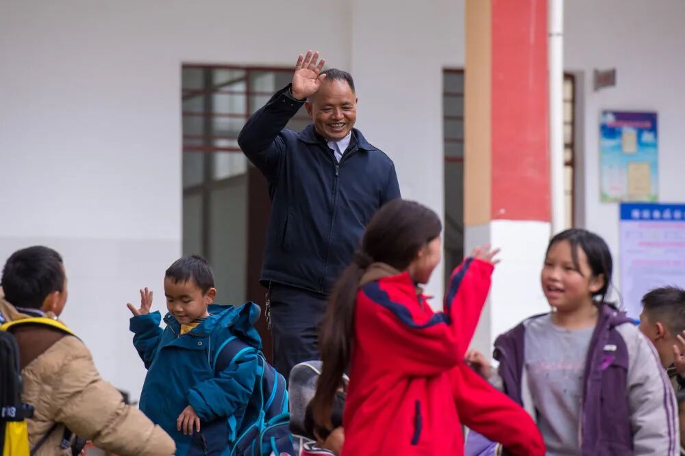 2025年2月18日,在落松地小学,农加贵(中)下课后和学生挥手告别。新华社记者 彭奕凯 摄