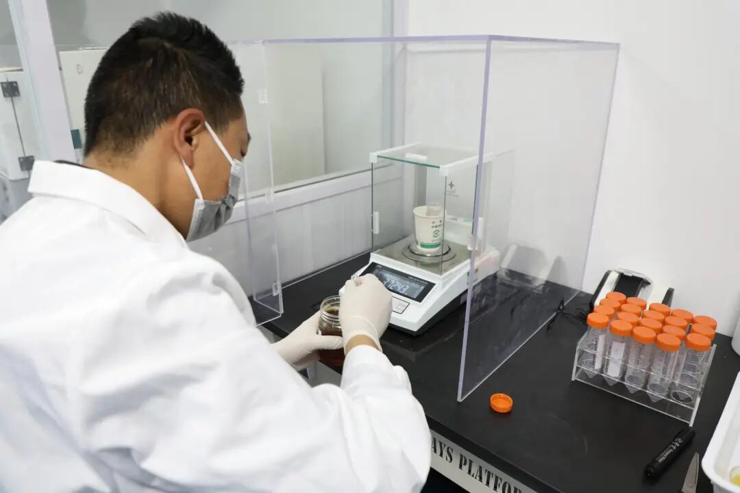 走进“天平室”,检测人员正小心翼翼地拿起一瓶待检测的蜂蜜样品,先用精密的电子分析天平进行称样,每一个动作都精准而熟练。称样完成后,样品被转入“有机前处理室”进行样品前处理,伴随着适度的摇晃,蜂蜜与试剂充分融合,再经过引流、定容、过滤等环节,进入“液相色谱仪”上机分析阶段。