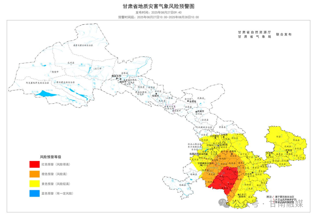 甘肃省自然资源厅、甘肃省气象局于2025年8月27日9时40分发布地质灾害气象风险预警:预计未来24小时内(8月27日10时至8月28日10时),甘肃省甘南藏族自治州(卓尼县、舟曲县、迭部县),陇南市(宕昌县、礼县),定西市(漳县、岷县),天水市(武山县)发生崩塌、滑坡、泥石流等地质灾害的风险很高(红色预警);甘南藏族自治州(合作市、临潭县),兰州市(榆中县),陇南市(武都区、文县),定西市(安定区、通渭县、陇西县、渭源县、临洮县),天水市(秦州区、甘谷县),临夏回族自治州(康乐县、广河县)发生崩塌、滑坡、泥石流等地质灾害的风险高(橙色预警);甘南藏族自治州(夏河县),庆阳市(西峰区、庆城县、环县、华池县、合水县、正宁县、宁县、镇原县),兰州市(城关区、七里河区、西固区、安宁区、红古区、永登县、皋兰县),陇南市(成县、康县、西和县、徽县、两当县),天水市(麦积区、清水县、秦安县、张家川回族自治县),白银市(白银区、平川区、靖远县、会宁县),临夏回族自治州(临夏市、临夏县、永靖县、和政县、东乡族自治县、积石山保安族东乡族撒拉族自治县),兰州新区,平凉市(崆峒区、泾川县、灵台县、崇信县、庄浪县、静宁县、华亭市)发生崩塌、滑坡、泥石流等地质灾害的风险较高(黄色预警),请注意防范。
