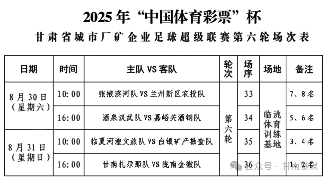 根据2025年甘肃省城市厂矿企业足球超级联赛(简称“陇超”)最新赛程,“陇超”排位赛第三轮将于8月30日-31日在临洮体育训练基地进行。备受关注的决赛将于8月31日16时压轴登场,对阵双方是甘南扎尕那队和陇南金徽队。