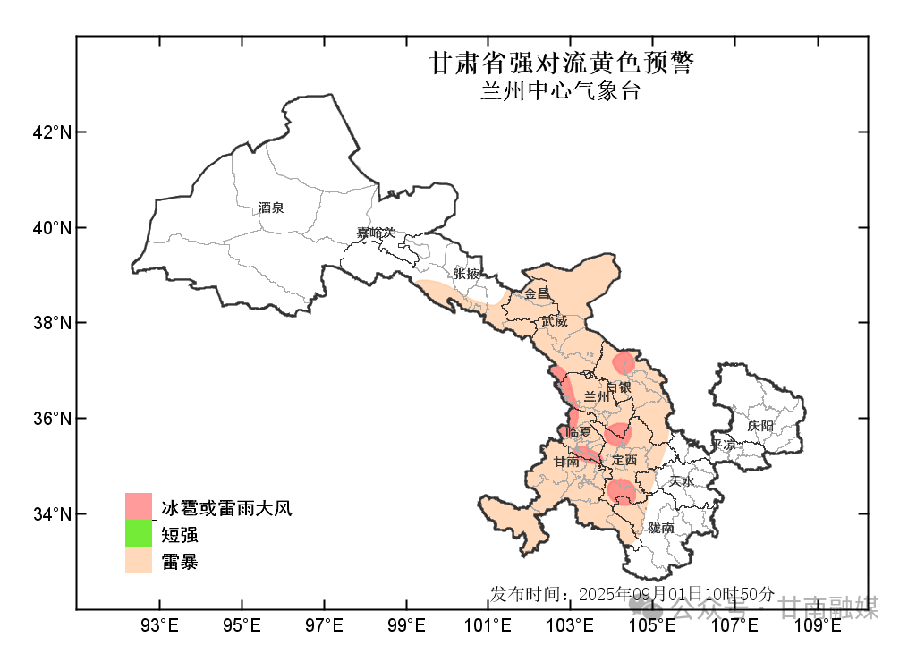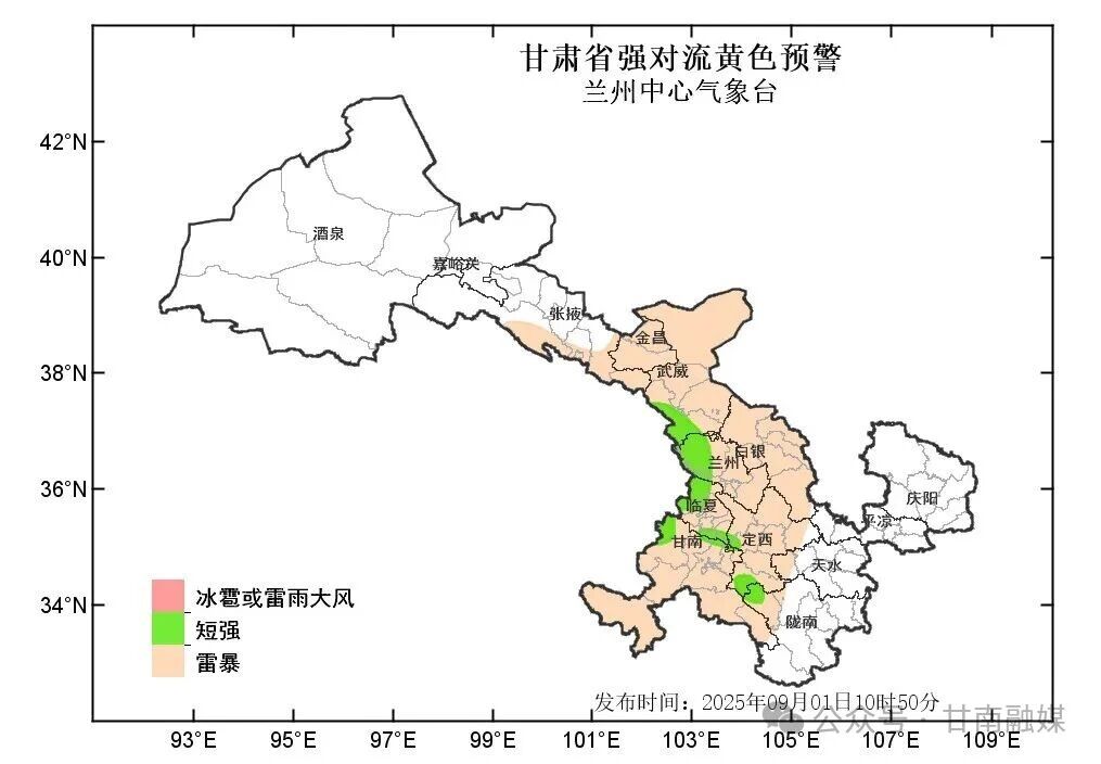 兰州中心气象台2025年9月1日10时50分发布强对流黄色预警:预计未来24小时,陇中、甘南高原、武威及祁连山区中东部有雷暴,其中,武威南部、兰州西部、临夏西部和南部、甘南北部、定西西部和南部、陇南西北部有短时强降水,强降水主要时段为1日20时至2日5时,小时雨强25-45毫米,最大可达60毫米;另外,武威南部、兰州西部和南部、临夏西部和南部、定西西部和南部、白银北部、陇南西北部有8-9级雷雨大风或冰雹,落区分散,主要时段为1日15时至23时。请注意防范!