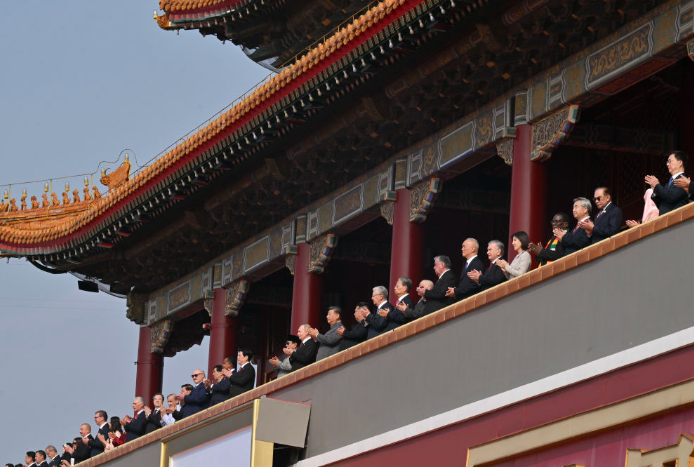 8时55分,习近平等中外领导人来到天安门城楼主席台,全场爆发出雷鸣般的掌声。