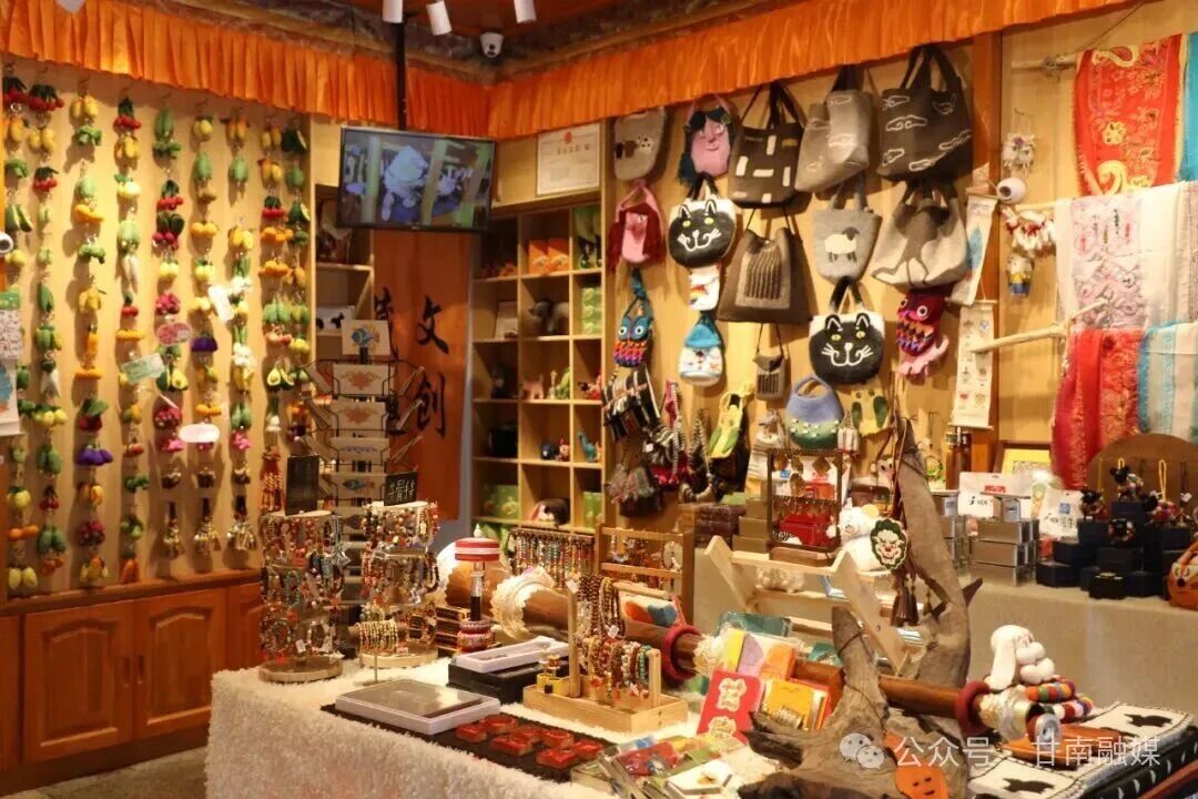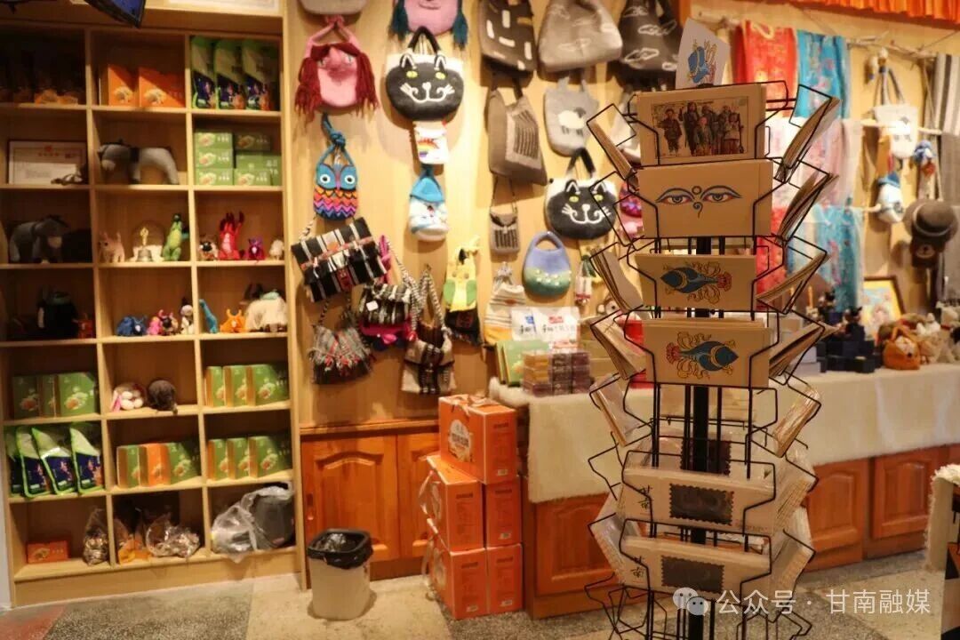 进入店内,木质展架上错落摆放着各类文创产品:印着拉卜楞寺建筑纹样的笔记本、憨态可掬的甘加羊玩偶、融入“擦擦”元素的冰箱贴、散发着清雅香气的本地藏香……游客们一边挑选商品,一边与店主交流,小小的店铺里满是热闹的互动场景。