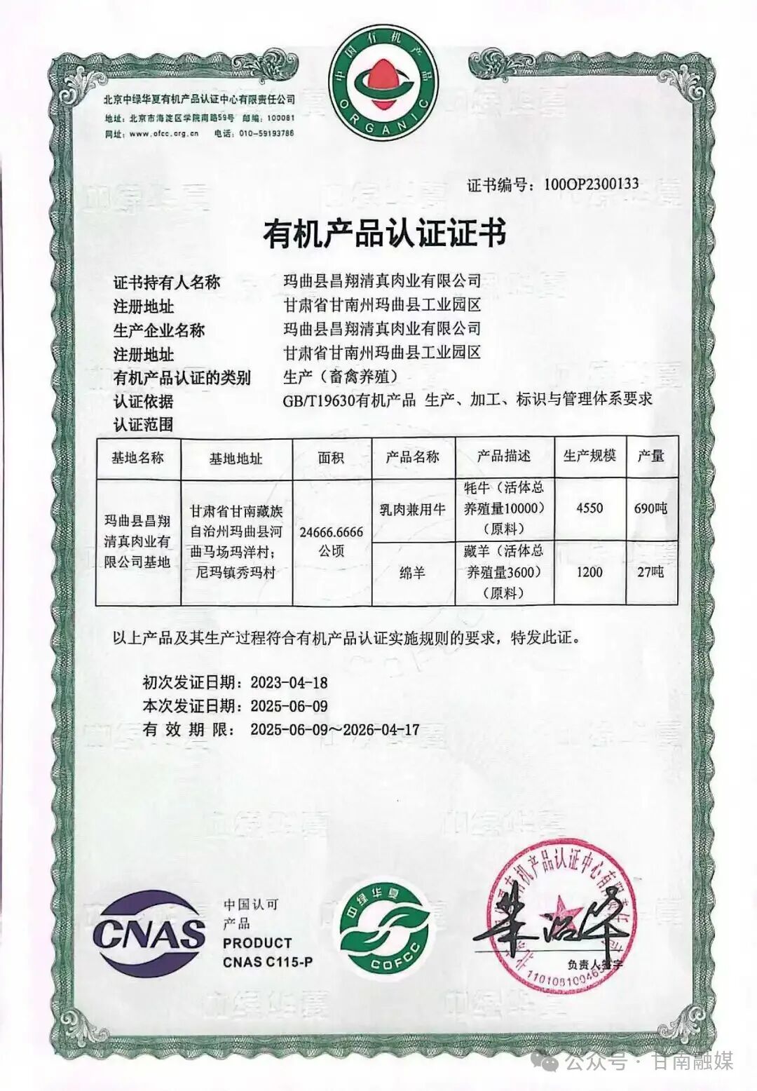 玛曲县昌翔清真肉业有限公司申报的“玛曲牦牛肉”“玛曲藏羊肉”有机产品和甘肃金亚克奶业贸易有限公司申报的“玛曲牦牛牛乳”有机产品,分别在2023年和2025年经北京中绿华夏有机产品中心专家评审,符合全国绿色有机农产品标准要求,获得有机转换证书。以上2家企业申报有机产品的基地拥有有机草场面积达100余万亩。