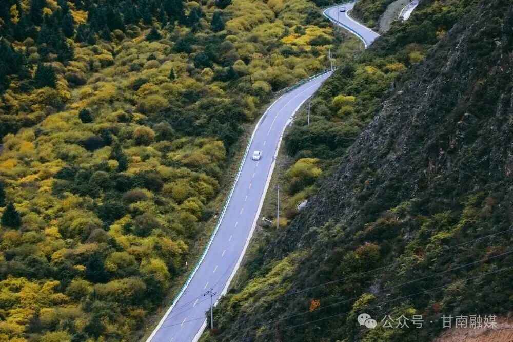 扎油沟的秋,是大自然打翻的调色盘。山林间,红、黄、绿交织,如绚丽织锦铺满山坡。蜿蜒公路穿梭其中,一辆小车驶过,似在画中漫游。这里的秋,静谧又热烈,每一片叶都藏着诗意,让人沉醉在这斑斓的秋日童话里。
